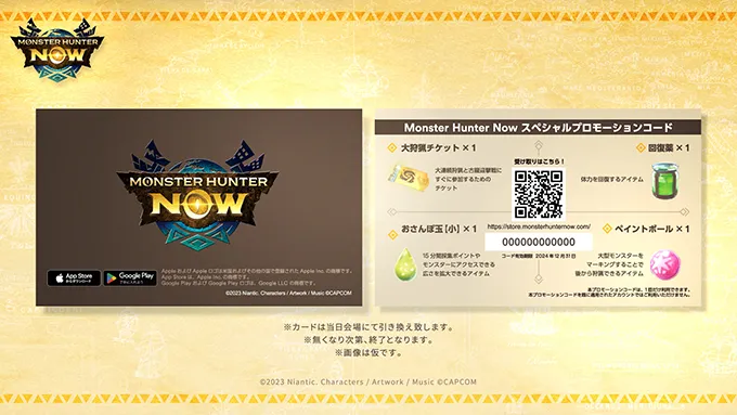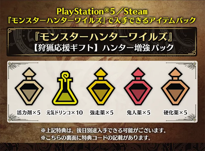 大狩猟展にご来場いただいた方に、PlayStation®5 /Steam『モンスターハンターワイルズ』で入手できるアイテムパック、『モンスターハンターNow』のゲーム内アイテムを入手できるスペシャルプロモーションコードカード、大狩猟展限定のポストカード(2枚組)の特典をセットで差し上げます!